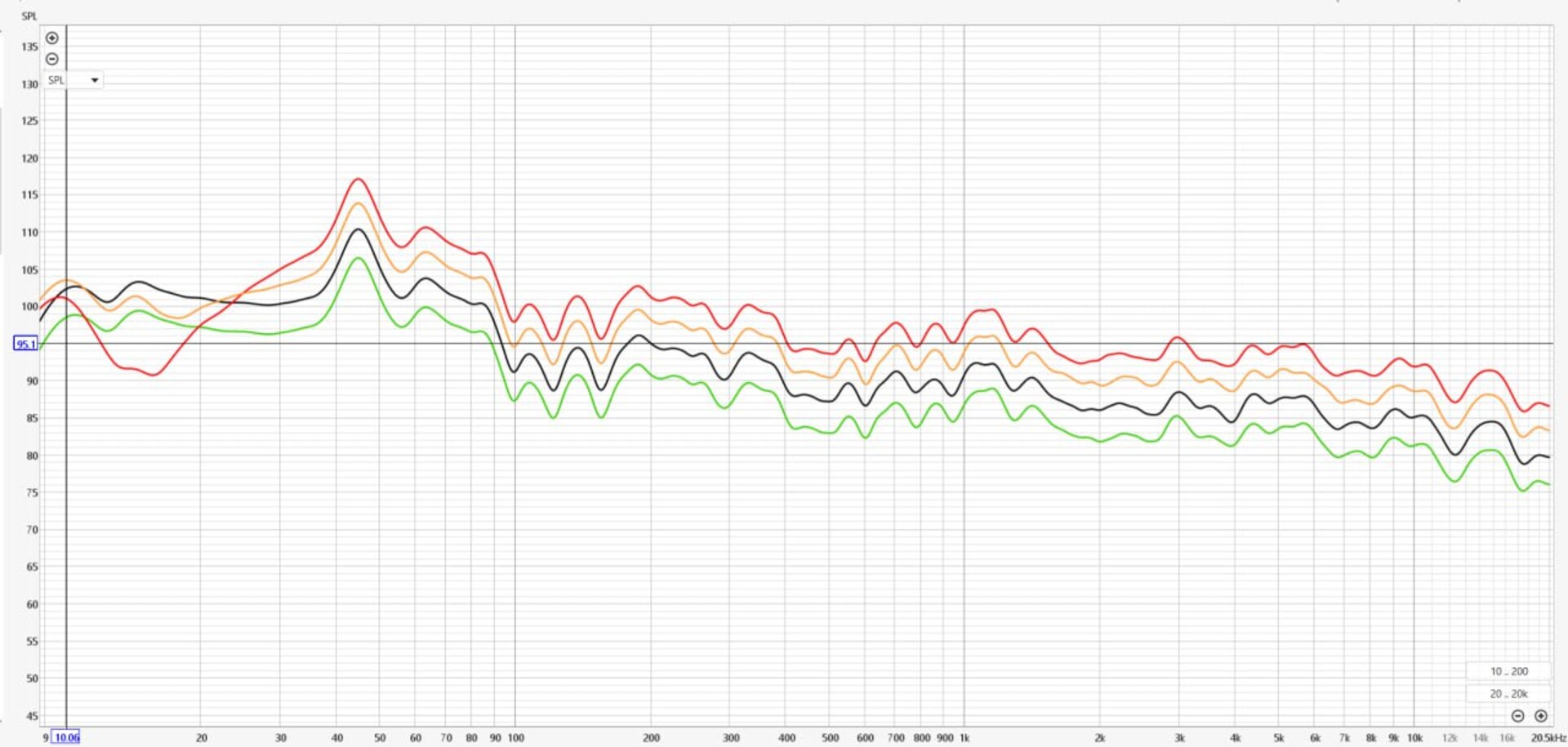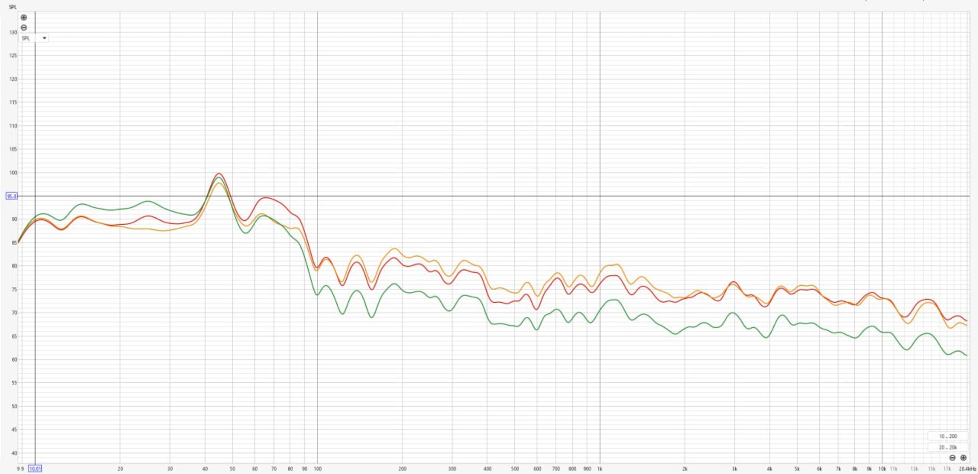 In the measurements below you can clearly see the dynamic compression working its “magic” at higher than 50% volume. Measurements are done with the microphone in the listening position.