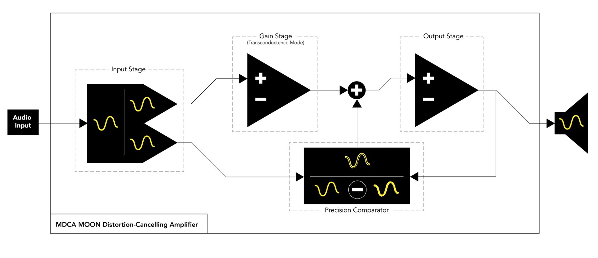 MDCA is Simaudio’s proprietary distortion correction architecture. Instead of relying on traditional global negative feedback loops that route the output signal back through the input stage, MDCA introduces a separate correction path that operates entirely outside the main audio signal path.