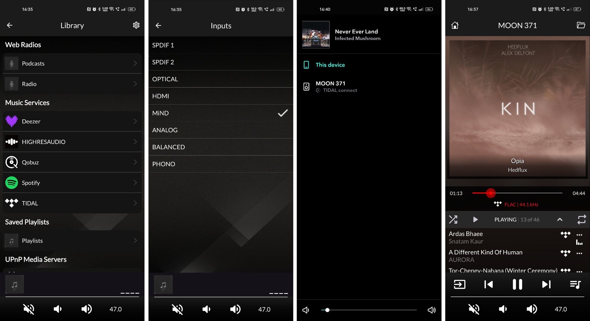 The third image demonstrates TIDAL Connect in operation, where the MOON 371 appears as a selectable playback device. This confirms native integration with streaming platforms, allowing music to be pushed directly to the unit while maintaining high-resolution signal paths.